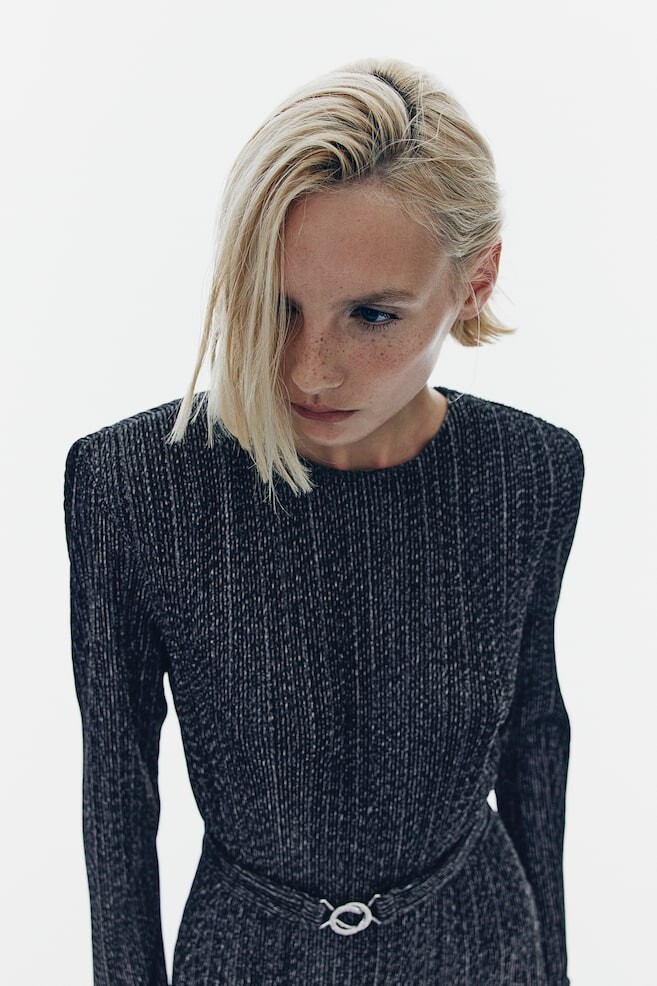 Короткое платье из плиссированного трикотажа с блестящей пряжей. Круглый вырез горловины и разрез на потайной пуговице. Подплечники, длинные рукава и эластичный пояс с металлической пряжкой, украшенной стразами. На подкладке.