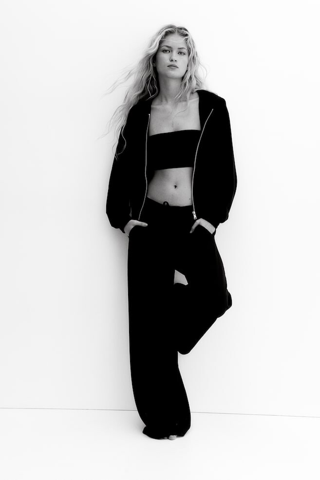 Толстовка из джерси в рубчик. Модель с двухслойным капюшоном на кулиске, молнией спереди и свободным кроем. Вырез на плечах, передние карманы, эластичные манжеты и нижний край со сборками.