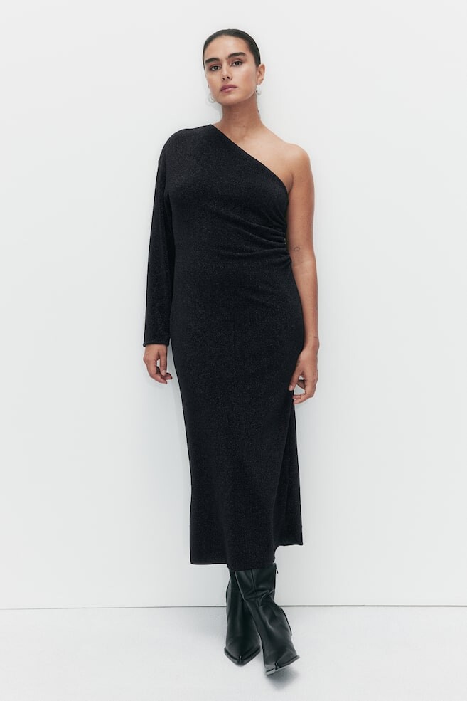 Облегающее фигуру платье длиной до икры из трикотажа с блестящими нитками. Асимметричный вырез с открытыми плечами с одной стороны, длинный рукав и рюши на талии с одной стороны для создания драпированного эффекта. На подкладке сверху. Размер модели: рост модели 175 см/5 футов 9 дюймов, размер M. Размер: Рукав: Длина: 72,5 см (Размер M), Перед: Длина: 124,5 см ( Размер M) Длина: Миди Длина рукава: Длинный рукав Посадка: Обычная посадка Стиль: Облегающий, Драпированный, На одно плечо Вырез: Асимметричный вырез горловины