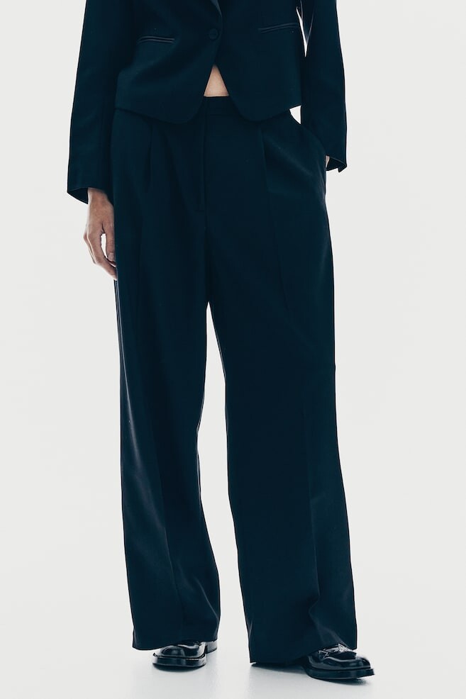 Элегантные тканевые брюки свободного кроя с высоким поясом, молнией, потайной пуговицей и застежкой на крючок. Косые боковые карманы, ложные прорезные карманы сзади и прямые брючины со складками и прижатыми складками спереди и сзади. Размер модели: рост модели 180 см/5 футов 11 дюймов, размер 42. Размер: Талия: Окружность: 72,0 см (размер M), внутренняя часть штанины: Длина: 74,0 см (размер M) Длина: Длинная Высота талии: Высокая талия Посадка: Свободная Посадка Стиль: прямые брюки, костюмные брюки.