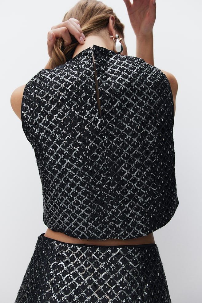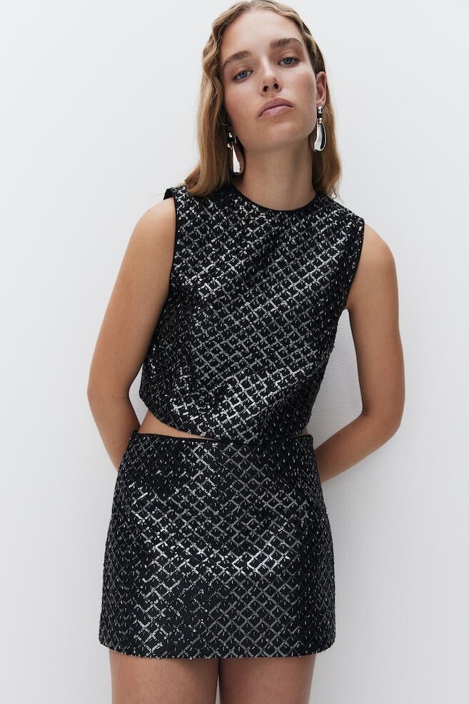 Короткая майка из тканого материала, украшенная мелкими костяными бусинами и мерцающими пайетками, образующими ромбовидный узор. Модель с круглым вырезом, разрезом на потайной пуговице и прямым низом. На подкладке. Рост модели: рост модели 178 см/5 футов 10 дюймов, размер S. Длина: короткая Длина рукава: без рукавов Посадка: стандартная посадка Фильм: каплевидный вырез , Майка Вырез: круглый Концепция: РАЗДЕЛЕННАЯ