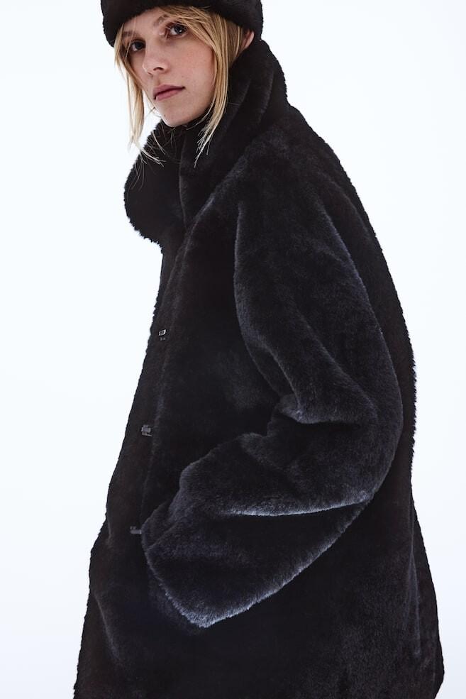 Пальто оверсайз длиной до колена из мягкой, пушистой ткани с воротником стойкой и застежкой на крючки спереди. Заниженная линия плеча, открытые карманы и прямой подол. На подкладке.