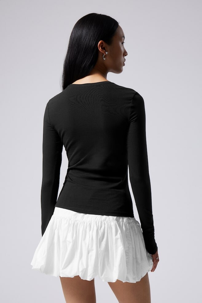 Облегающий топ с длинными рукавами облегающего силуэта из мягкого хлопкового джерси с легким эластаном из переработанного сырья для дополнительной эластичности и комфорта. Топ имеет круглый вырез и прямой низ. Рост модели: рост модели 176 см/5 футов 9 дюймов, размер S. Длина: стандартная длина Длина рукава: длинный рукав Посадка: приталенный крой Вырез: круглый вырез