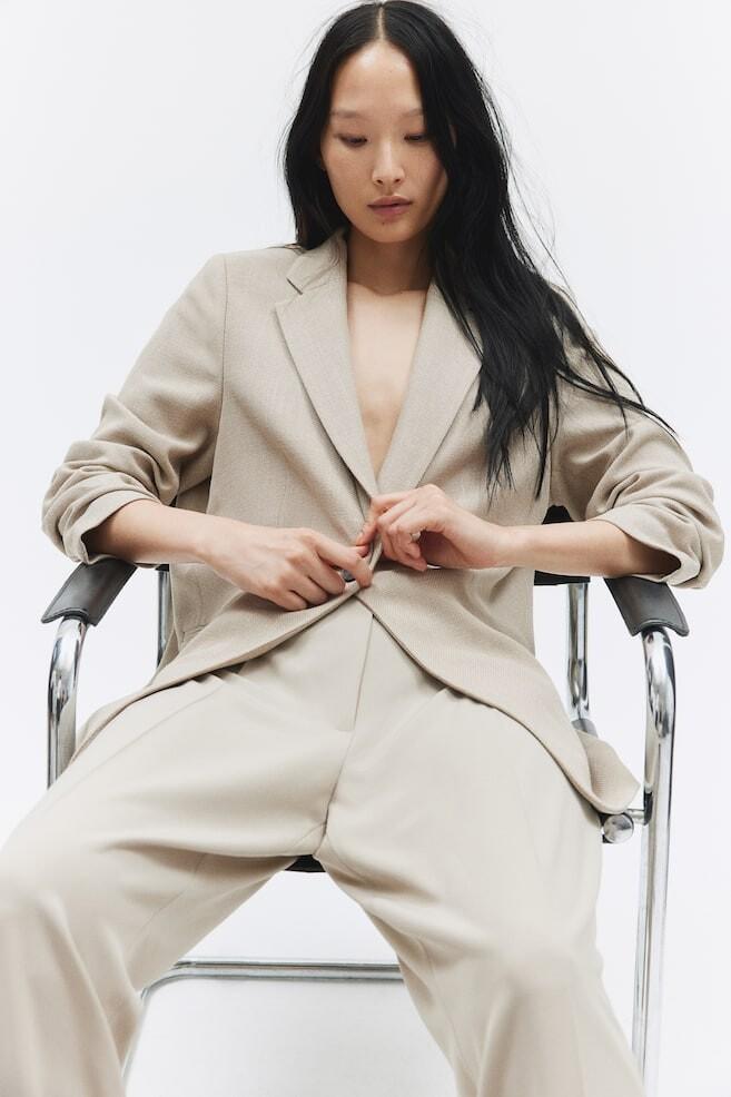 Немного удлиненный тканевый пиджак с воротником с лацканами и пуговицей спереди. Свободная посадка. Передние карманы с окантовкой, подплечники и рукава со сборками 3/4. На подкладке. Размер модели: рост модели 177 см/5 футов 10 дюймов, размер M. Размер: плечо: ширина: 40,5 см (размер M), спина: длина: 74,5 см (размер M). Длина: Длинная Длина рукава: Рукав 3/4 Посадка: Свободный крой Воротник: воротник с лацканами Фильм: Блейзер, Один ряд