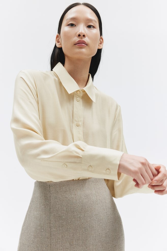 Блузка из тканого материала с воротником и планкой на пуговицах спереди. Кокетка сзади со складкой и длинными рукавами с манжетами на пуговицах и пуговицей в разрезе рукавов. Изогнутый низ. Размер модели: рост модели 177 см/5 футов 10 дюймов, размер L. Размер: Спина: Длина: 69,0 см (размер M), ширина плеч: 41,5 см (размер M). ), Рукав: Длина: 60,5 см (размер M) Длина: Нормальная длина Длина рукава: Длинный рукав Посадка: Обычная посадка Воротник: Отложной воротник