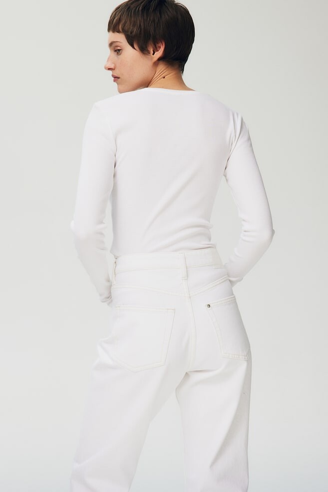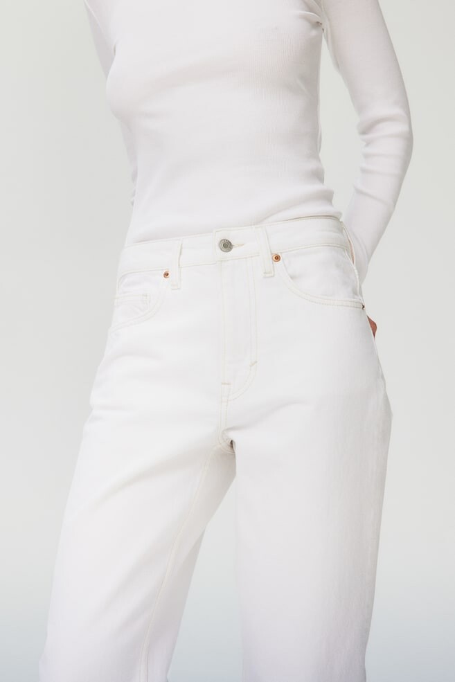 Бренд: H&M Цвет: белый Состав: Внешний слой: 100% хлопок Подкладка карманов: 100% хлопок 25% переработанный хлопок >Вес мелких деталей, таких как нитки, пуговицы, молнии, украшения и принты, не учитываются. Рассчитывается общий вес изделия, путем сложения веса всех слоев и основных компонентов. Исходя из этого, посчитаем, какая часть этого веса приходится на каждый материал. При расчете комплектов и нескольких упаковок все предметы учитываются как одно изделие. Материал: Хлопок, Джинсовая ткань.