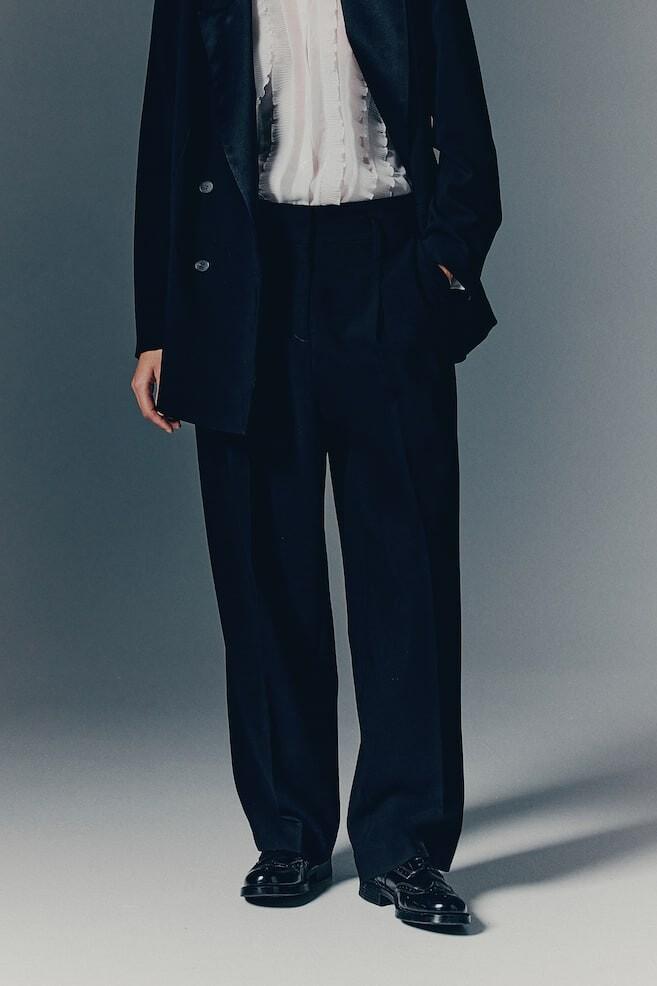 Элегантные тканевые брюки свободного кроя с высокой талией, ширинкой на молнии и потайным крючком. Косые боковые карманы, ложный прорезной карман сзади и широкие, слегка зауженные брючины со складками и загнутыми складками спереди и сзади. Размер модели: рост модели 180 см/5 футов 11 дюймов, размер 42. Размер: внутренняя часть штанины: длина: 75,0 см (размер 40), талия: окружность: 78,5 см (размер 40) длина: Длинная Высота талии: Высокая талия Посадка: Свободная посадка Фильм: Зауженный