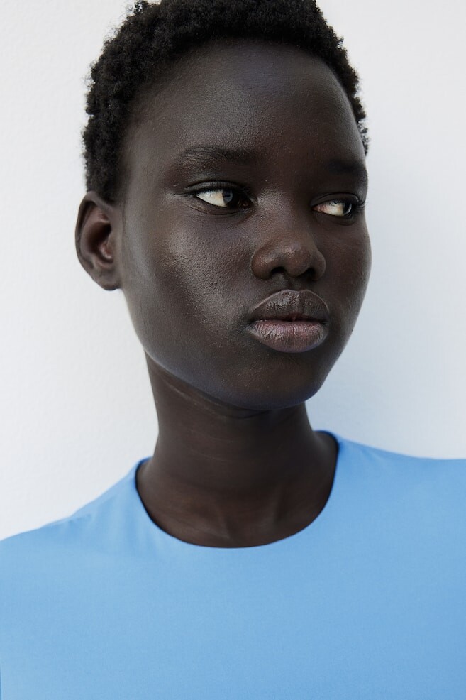 Обтягивающая фигуру рубашка из эластичного трикотажа с круглым вырезом и короткими рукавами.