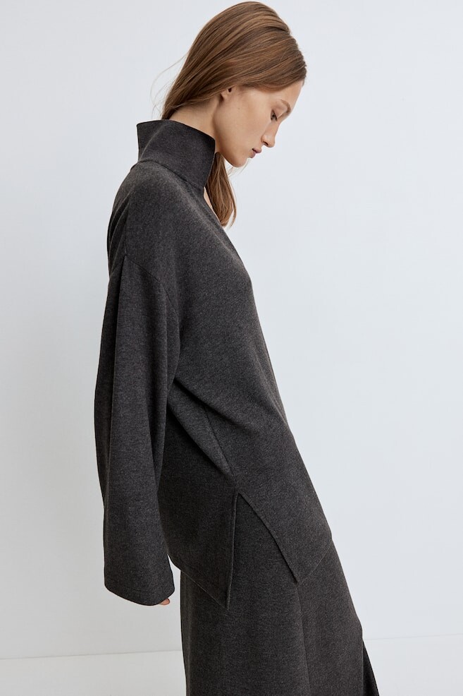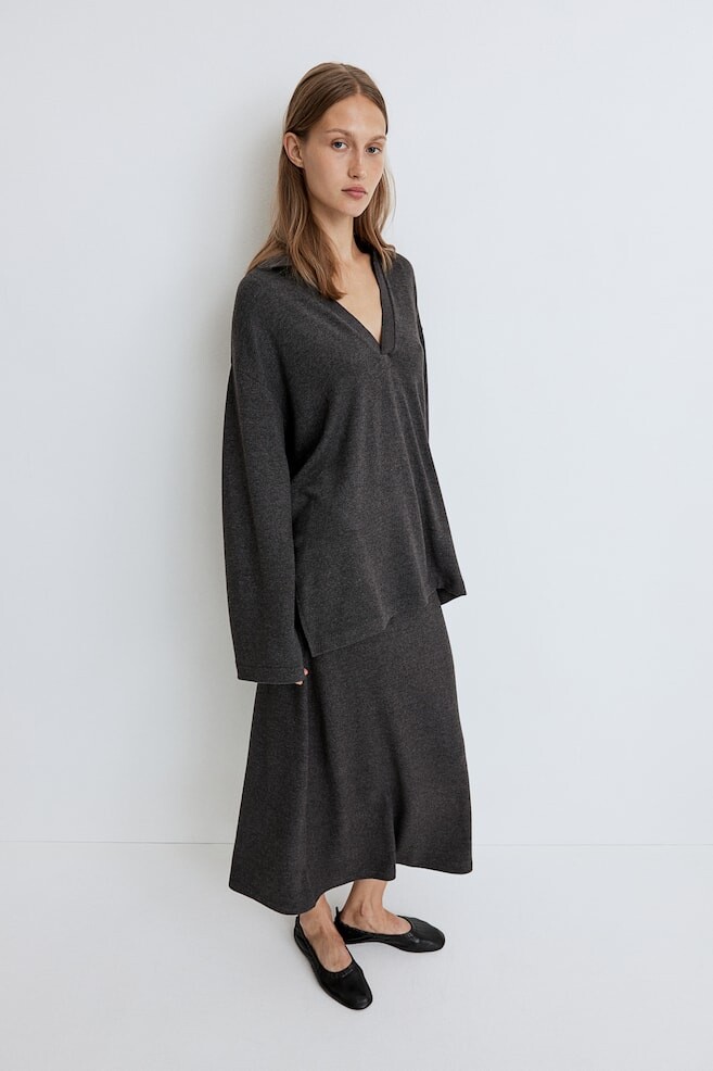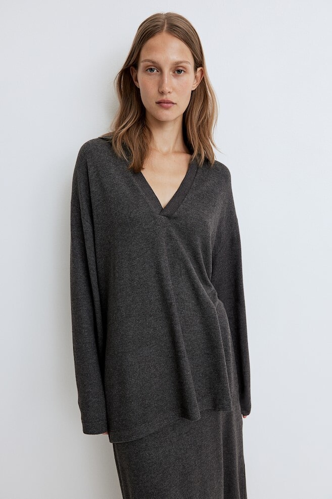 Повседневная рубашка из мягкого трикотажа с воротником и V-образным вырезом спереди. Заниженная линия плеча, длинные рукава и прямой низ с разрезами по бокам.