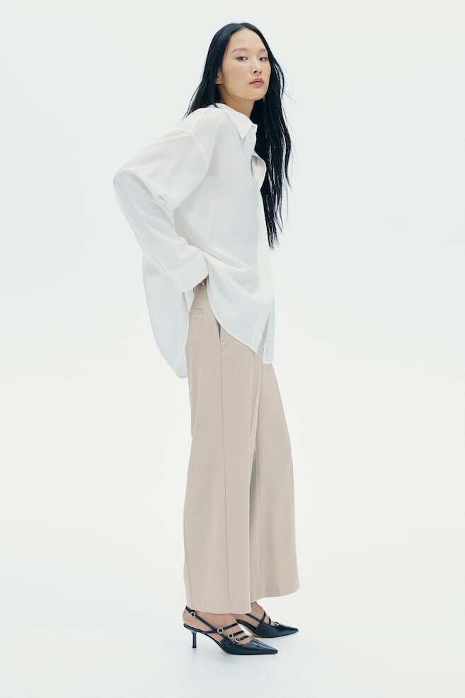 Элегантные брюки из твила с высокой талией, застежкой-молнией и потайной пуговицей на крючок. Незаметные боковые карманы, ложные прорезные карманы сзади и широкие брючины длиной до щиколотки с прижатыми складками спереди и сзади. Размер модели: рост модели 177 см/5 футов 10 дюймов, на ней размер 38. >Размер: Внутренняя часть штанины: Длина: 64,5 см (размер 40), Талия: Окружность: 80,5 см (размер 40) Длина: Длина 7/8 Высота талии: Высокая талия Посадка: Стандартная посадка Фильм: Широкий