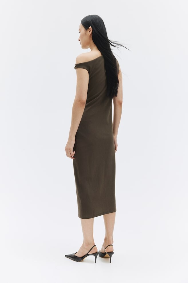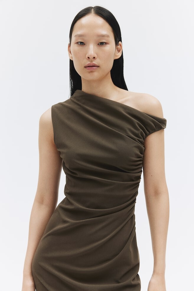 Облегающее фигуру платье длиной до икры из структурированного трикотажа. Модель без рукавов, на одно плечо, с асимметричным вырезом. Присборенный боковой шов создает эффект драпировки и привлекательный силуэт. Частичная подкладка. Размер модели: рост модели 177 см/5 футов 10 дюймов, размер S. Размер: Спина: Длина: 119,5 см (размер M) Длина: миди Рукав длина: Без рукавов Посадка: Приталенный Фильм: Облегающий, Драпированный Вырез: Асимметричный вырез