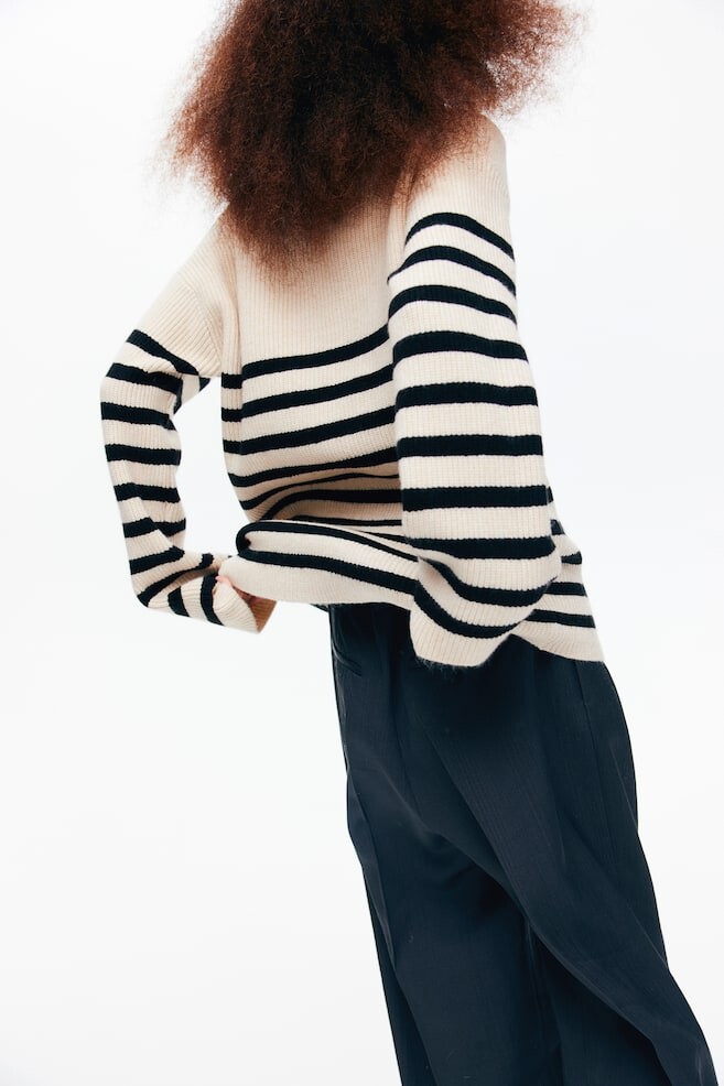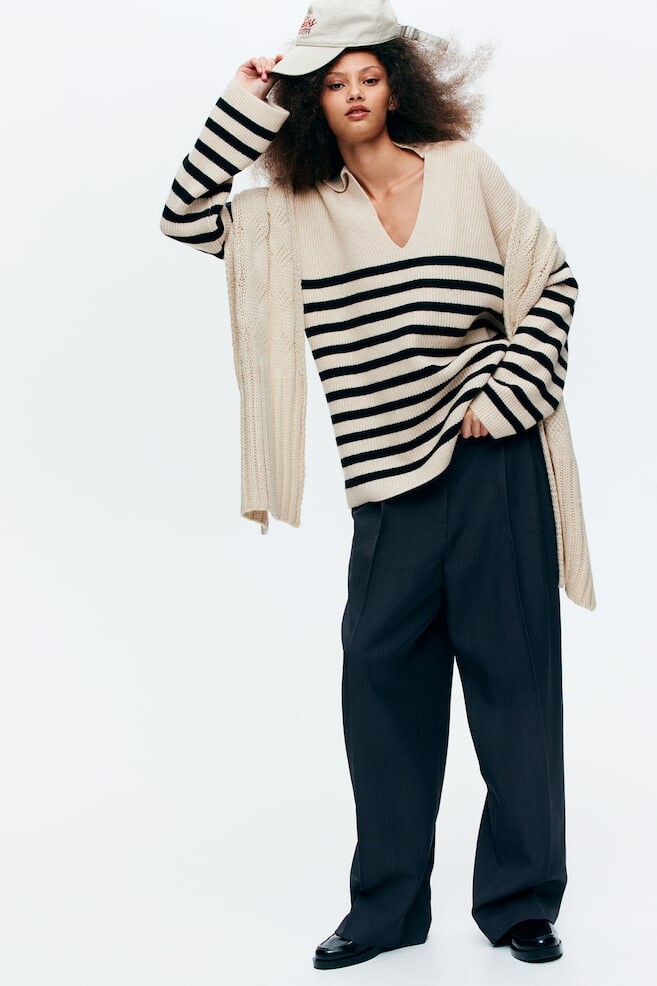 Повседневный свитер из ребристой вязки с воротником, V-образным вырезом и глубоким вырезом на плечах.