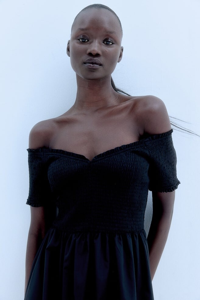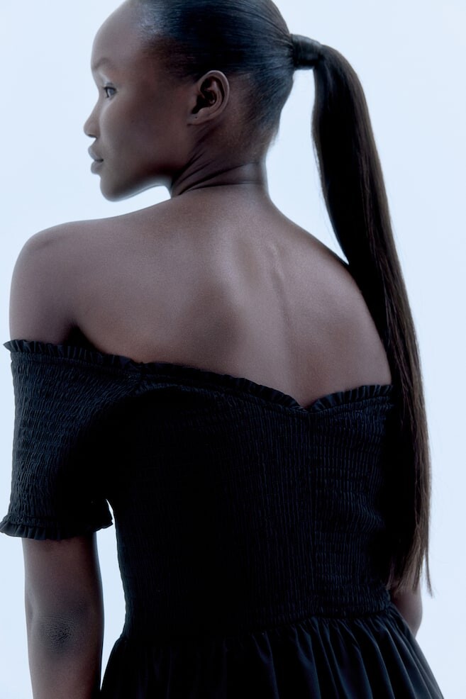 Платье из ткани длиной до икры с V-образным вырезом без плеч, облегающим лифом и короткими рукавами со сборками. Прикрепленная часть юбки расклешена. Без подкладки. Размер модели: рост модели 180 см/5 футов 11 дюймов, размер S. Размер: Рукав: Длина: 15,5 см (размер M) Длина: Миди Длина рукава Модель: Короткий рукав Посадка: Обычная посадка Фильм: Расклешенный, с открытыми плечами, присборенный Вырез: V-образный вырез