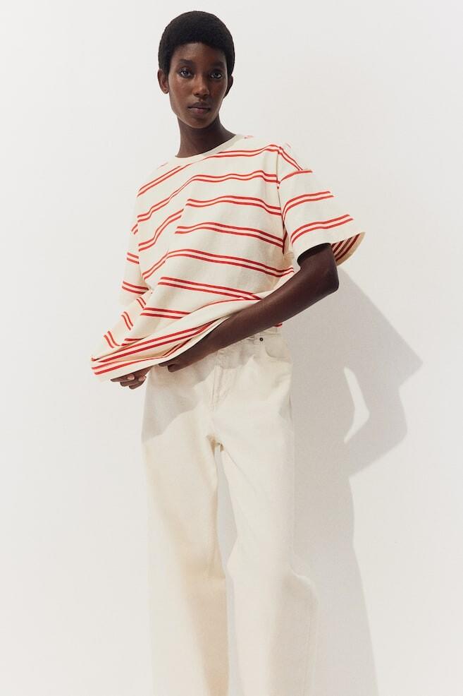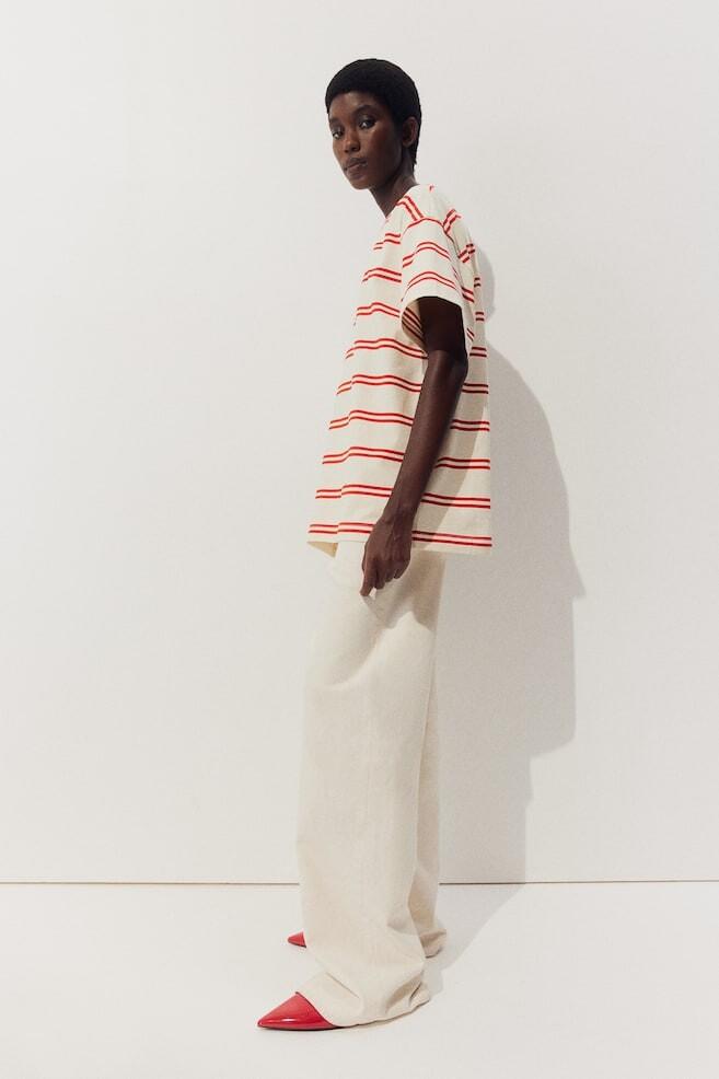 Футболка оверсайз из мягкого хлопкового трикотажа с круглым вырезом в рубчик, сильно заниженной линией плеч и прямым низом.
