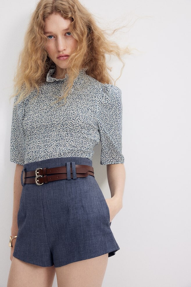 Облегающая фигуру короткая блузка со сборками спереди и сзади, воротником с воланами, разрезом на шее на пуговицах и пышными рукавами до локтя. Размер модели: рост модели 178 см/5 футов 10 дюймов, размер M. Размер: плечо: ширина: 32,5 см (размер M), спинка: длина: 47,0 см (размер M), рукав: длина: 36,5 см (размер M) Длина: Короткая Длина рукава: Рукав 3/4 Посадка: Slim Fit Воротник: волан, воротник-стойка Фильм: Присборенный