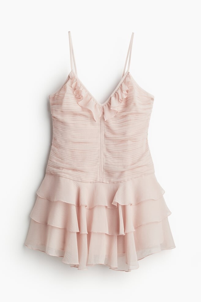 Короткое платье из мятого шифона с V-образным вырезом и узкими бретелями. Приталенный топ с рюшами спереди, сзади и по бокам. Потайная молния сзади на крючке и расклешенная многоярусная юбка с оверлочными краями. На подкладке. Рост модели: рост модели 177 см/5 футов 10 дюймов, на ней размер S. Длина: короткая Длина рукава: Без рукавов Посадка: Свободный крой Стиль: Расклешенное платье, Платье на узких бретелях Вырез: V-образный Концепция: РАЗДЕЛЕННАЯ