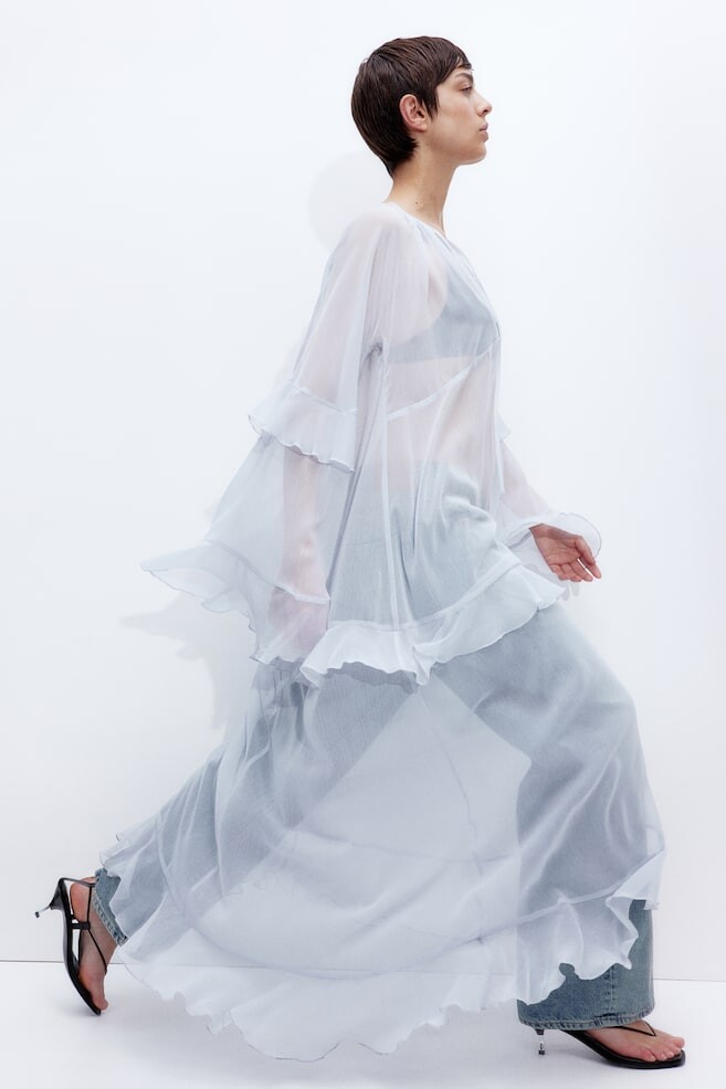 Платье длиной до икры из мятого шифона с круглым вырезом и V-образным вырезом на узких завязках спереди. Свободный крой с сильно заниженной линией плеч, длинными рукавами-трубами и воланами с оверлоками на плечах, бедрах, манжетах и подоле. Без подкладки. Длина: Миди Длина рукава: Длинный рукав Посадка: Свободный крой Фильм: Завязки спереди Вырез: Круглый вырез Фон рукава: Рукав-труба Концепция : РАЗДЕЛЕННЫЙ