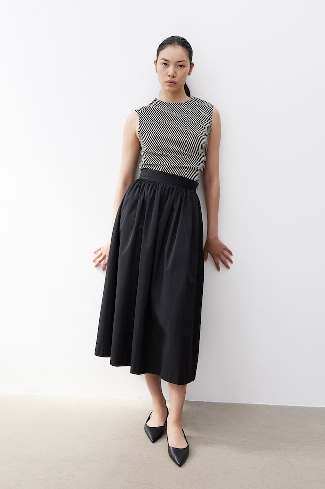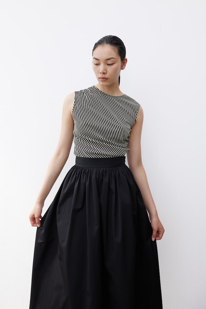 Приталенная майка с круглым вырезом из структурированного трикотажа. Сборки на одном плече и сбоку создают мягкий струящийся силуэт.