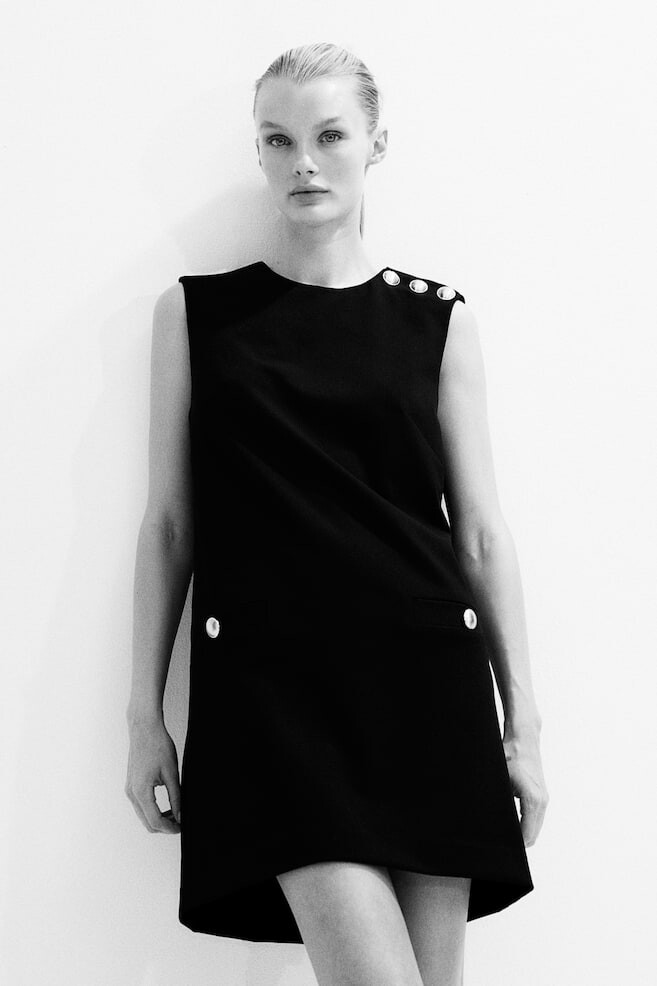 Короткое платье без рукавов из тканого материала с круглым вырезом и золотистыми пуговицами на одном плече. Потайная молния сзади, вытачки на груди и прорезные карманы на пуговицах спереди. Без подкладки. Размер: Плечо: Ширина: 40,0 см (размер M), Спина: Длина: 83,5 см (размер M) Длина: Короткая Длина рукава: Без рукавов Посадка: Обычная посадка > Вырез: Круглый Что нужно знать: С карманом
