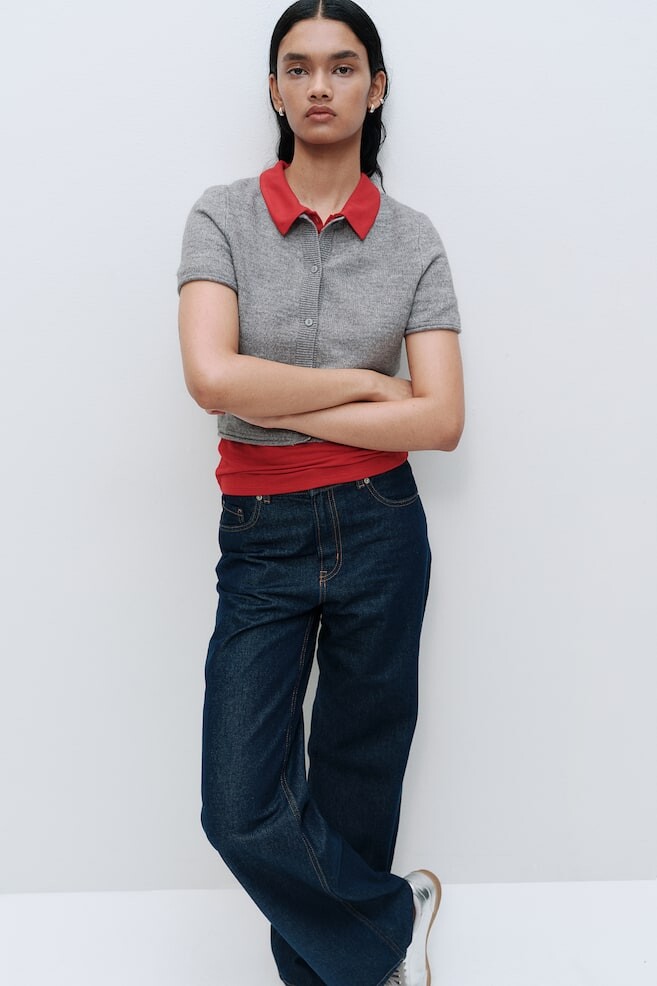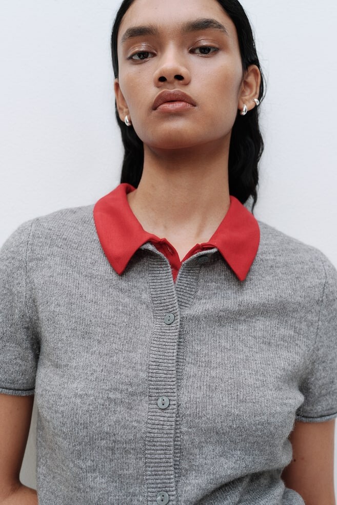 Короткий облегающий фигуру кардиган из мягкой тонкой вязки с круглым вырезом в рубчик, перламутровыми пуговицами спереди, короткими рукавами и ребристой окантовкой планки с пуговицами. Завернутые края на манжетах и по нижнему краю. Размер модели: рост модели 177 см/5 футов 10 дюймов, размер S. Длина: короткая Длина рукава: короткий рукав Посадка: приталенная Вырез: круглый вырез Концепция: РАЗДЕЛЕННАЯ