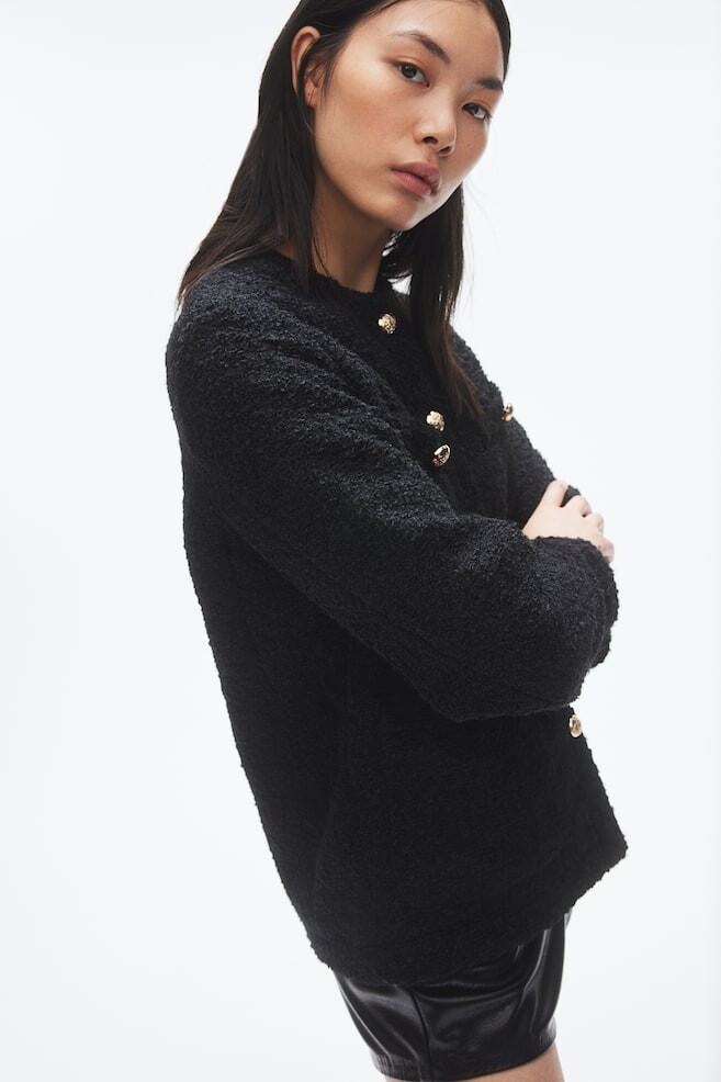 Жакет из ткани букле с круглым вырезом и металлическими пуговицами. Накладные передние карманы на пуговицах и ложные нагрудные карманы на пуговицах. На подкладке. Размер: Спинка: Длина: 67,0 см (размер M), Рукав: Длина: 61,0 см (размер M), Плечо: Ширина: 44,0 см (размер M) Длина: Нормальная длина Рукав длина: длинный рукав Посадка: стандартная посадка Фильм: без воротника, однобортный Вырез: круглый вырез
