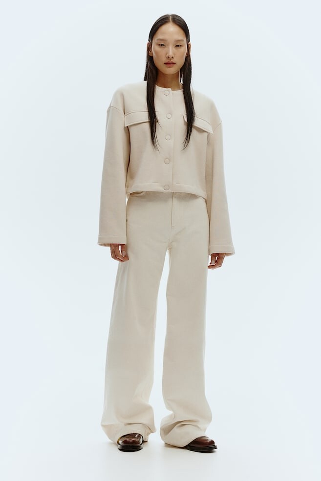 Немного укороченный кардиган из смесового хлопка тренировочного качества с мягким начесом внутри. Небольшой ребристый воротник, кнопки спереди, перекрытие плеч и ложные карманы с клапаном на груди.