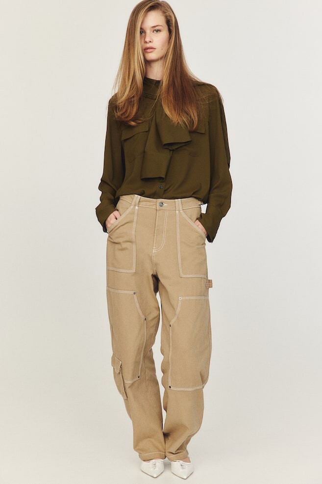 Брюки свободного кроя из хлопкового твила с застежкой-молнией и пуговицей. Талия стандартной высоты с регулируемым ремнем и металлической пряжкой с обеих сторон. Накладные карманы спереди и открытые карманы сзади. Широкие штанины с заплатками. Петля-молоток на одной штанине и карман-книжка с клапаном на другой. Размер модели: рост модели 178 см/5 футов 10 дюймов, на ней размер 38. Размер: Внутренняя часть штанины: Длина: 76,5 см ( размер 40), Талия: Окружность: 82,5 см (размер 40) Длина: Длинная Высота талии: Нормальная высота талии Посадка: Свободная Подходит Стиль: Карго, Широкий Концепция: РАЗДЕЛЕННАЯ