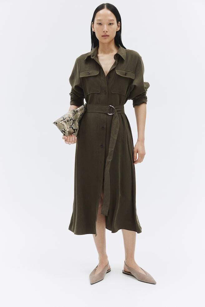 Платье из твила длиной до икры, застегивающееся на пуговицы, с воротником и свободным кроем. Двухслойная кокетка сзади и накладные нагрудные карманы с клапанами на пуговицах. Слегка заниженная линия плеча и длинные рукава с манжетами на пуговицах и пуговицей в разрезе рукавов. Широкий съемный поясной ремень с металлическими D-образными кольцами. Размер модели: Рост модели 177 см/5 футов 10 дюймов, размер S. Размер: Плечо: Ширина: 43,0 см (размер M), спинка: Длина: 123,0 см (размер M), Рукав: Длина: 52,0 см (размер M) Длина: Миди Длина рукава: Длинный рукав Посадка: Свободный крой Воротник: Отложной Стиль: Платье-блузка Что нужно знать: С карманом