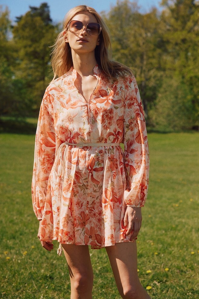 Короткое платье свободного кроя из смеси хлопка и вискозы. С воротником-стойкой, короткой планкой на пуговицах и съемным поясом из макраме. Вырез на плечах, длинные рукава-фонарики с узкой окантовкой с разрезом и пуговицей по низу. Без подкладки. Размер модели: рост модели 178 см/5 футов 10 дюймов, размер S. Размер: Рукав: Длина: 60,0 см (Размер M), Плечо: Ширина: 49,0 см (Размер M). , Спина: Длина: 88,5 см (размер M) Длина: Короткая Длина рукава: Длинный рукав Посадка: Свободный крой Вырез: V-образный вырез Фильм рукава: объемные рукава