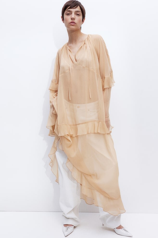 Платье длиной до икры из мятого шифона с круглым вырезом и V-образным вырезом на узких завязках спереди. Свободный крой с сильно заниженной линией плеч, длинными рукавами-трубами и воланами с оверлоками на плечах, бедрах, манжетах и подоле. Без подкладки. Длина: Миди Длина рукава: Длинный рукав Посадка: Свободный крой Фильм: Завязки спереди Вырез: Круглый вырез Фон рукава: Рукав-труба Концепция : РАЗДЕЛЕННЫЙ