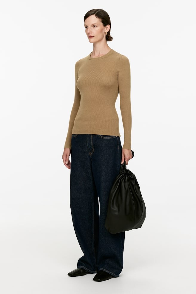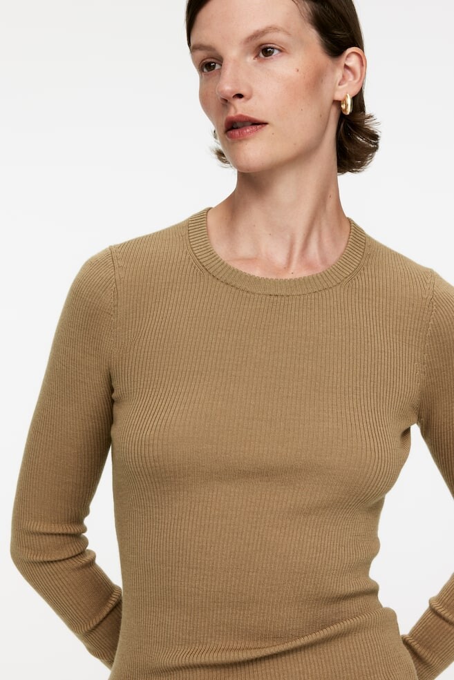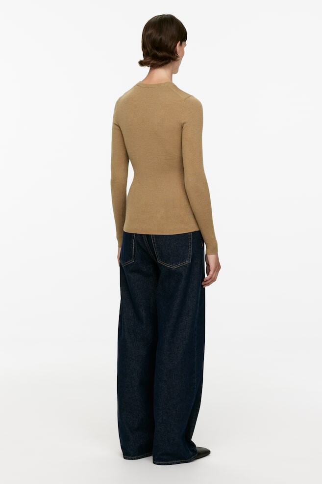 Топ с длинными рукавами связанный резинкой из шерсти мериноса. Ребристый круглый вырез. Тонкая посадка. Верх изготовлен из 100% шерсти, сертифицированной RWS (TE-00047206). Продукция, сертифицированная по стандарту ответственной шерсти (RWS), содержит шерстяные волокна с ферм, которые независимо сертифицированы на соответствие требованиям защиты животных и землепользования. Размер модели: рост модели 178 см/5 футов 10 дюймов, на ней размер S. . Длина: Обычная длина Длина рукава: Длинный рукав Посадка: Облегающий крой Вырез: Круглый вырез