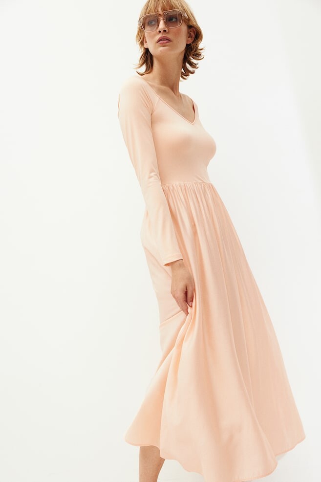 Платье длиной до икры с открытыми плечами, облегающим лифом из эластичного трикотажа, привлекательным V-образным вырезом и длинными рукавами. Присборенная талия и расклешенная тканая юбка. Без подкладки.
