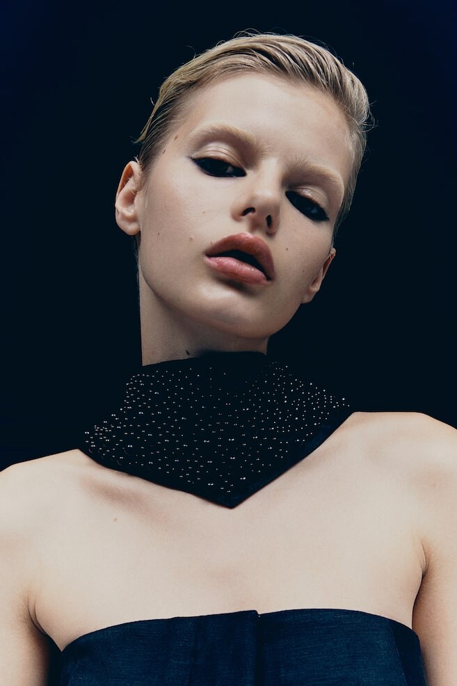 Треугольный шарф из мягко драпирующегося атласа, украшенный блестящими пластиковыми бусинами, создающими идеальный завершающий штрих.