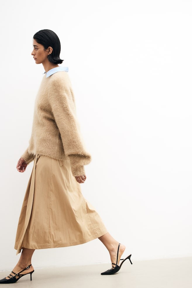 Юбка А-силуэта длиной до икры из плотной хлопчатобумажной ткани. Передняя часть с запахом, стильными складками и поясом с металлическими D-образными кольцами. Высокая талия с подчеркивающими фигуру вытачками и потайной молнией сзади. Без подкладки. Размер модели: рост модели 179 см/5 футов 10 дюймов, на ней размер 38. Размер: Талия: Окружность: 79,0 см (размер 40), спина: Длина: 83,0 см (размер 40). ) Длина: Миди Высота талии: Высокая талия Посадка: Обычная посадка Фильм: А-силуэт, крой с запахом