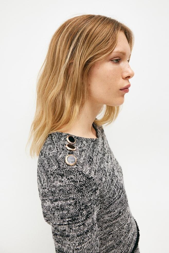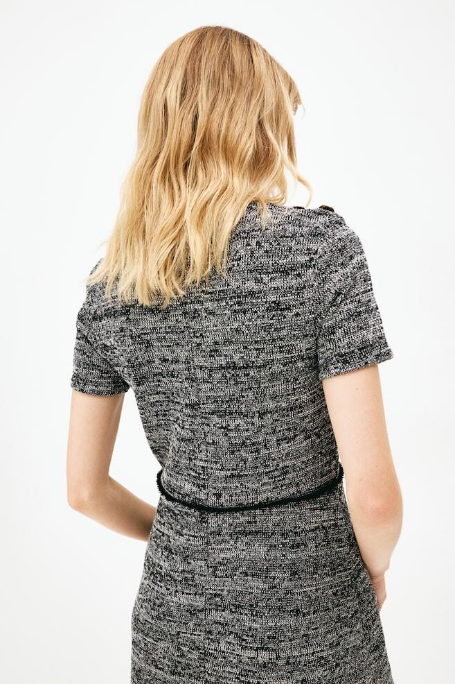 Короткое платье из структурированного трикотажа с круглым вырезом, короткими рукавами и декоративными пуговицами на одном плече. Край бахромы на талии. Рост модели: рост модели 176 см/5 футов 9 дюймов, размер S. Размер: Плечо: Ширина: 39,0 см (Размер M), Спина: Длина: 86,5 см ( Размер M), Рукав: Длина: 20,5 см (Размер M) Длина: Короткая Длина рукава: Короткий рукав Посадка: Обычная посадка Вырез: Круглый вырез