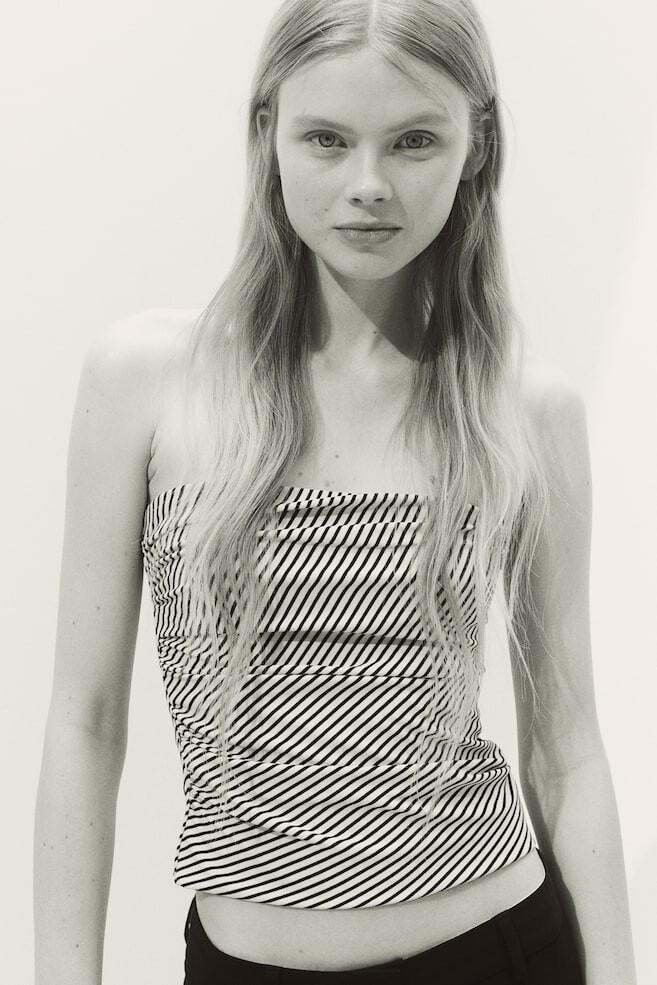 Облегающий фигуру топ-бандо из слегка мятого эластичного трикотажа. Потайная силиконовая лента сверху, потайная молния сбоку и оборки с другой стороны для нежной драпировки. На подкладке.