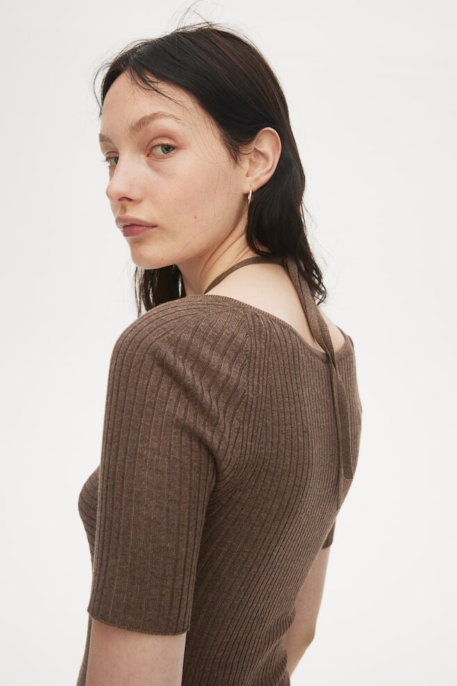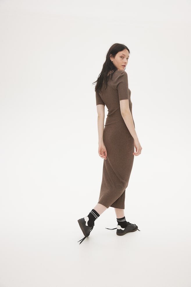 Облегающее фигуру платье длиной до икры из мягкого ребристого трикотажа с квадратным вырезом спереди, узкими бретелями и короткими рукавами реглан. Прямой низ с высоким разрезом спереди. Размер модели: Рост модели 179 см/5 футов 10 дюймов, на ней размер S. Размер: Спинка: Длина: 121,0 см (размер M), рукав : Длина: 30,5 см (размер M) Длина: миди Длина рукава: короткий рукав Посадка: приталенная Фильм: облегающий, вырез, Разрез Вырез: халтер, Квадратный вырез Фильм рукава: Рукава реглан Идея: РАЗДЕЛЕННАЯ