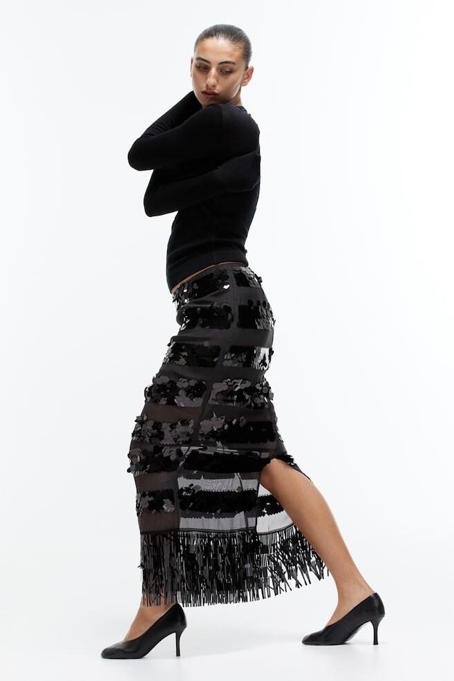 Длинная юбка из прозрачного плетения с блестящими полосками из круглых и квадратных пайеток. Слои полосатых пайеток по подолу создают эффект бахромы. Талия стандартной высоты с потайной молнией и крючком. На подкладке. Рост модели: рост модели 177 см/5 футов 10 дюймов, размер одежды 38. Длина: длинная Высота талии: стандартная талия Посадка: стандартная посадка Концепция: ИЗДАНИЕ H&M