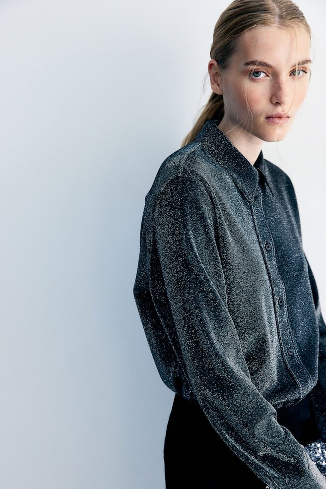 Блуза из эластичного трикотажа с блестящей пряжей. С воротником, планкой на пуговицах и кокеткой сзади со складками. Длинные рукава с манжетами на пуговицах и закругленным краем. Размер: Спинка: Длина: 69,0 см (Размер М), Рукав: Длина: 60,0 см (Размер М), Плечо: Ширина: 41,5 см (Размер М) Длина: Длинная Длина рукава: Длинный рукав Посадка: Классический крой Воротник: Отложной воротник