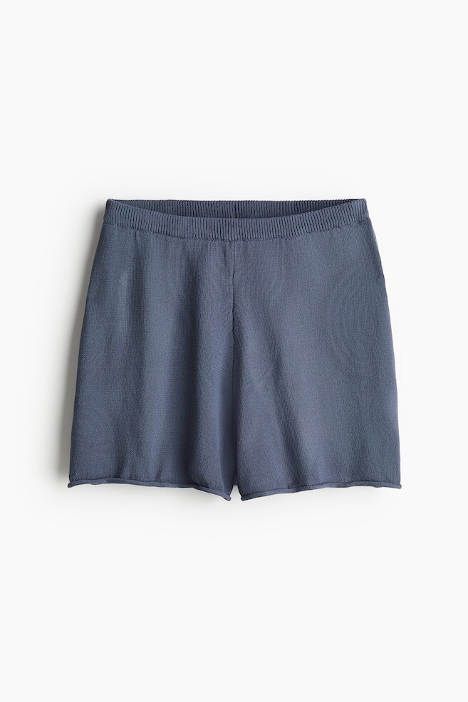 Шорты из мягкого трикотажа с эластичным ребристым поясом и закругленными краями на манжетах.