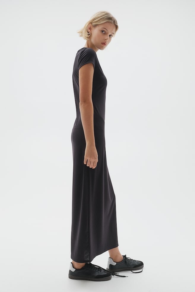 Длинное облегающее фигуру платье из мягкого трикотажа с круглым вырезом, узкой отделкой, короткими рукавами и прямым низом.