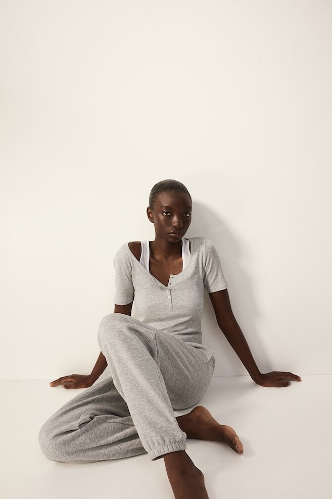 Облегающая фигура футболка Henley из мягкого трикотажа в рубчик с глубоким круглым вырезом, небольшой планкой на пуговицах и короткими рукавами.