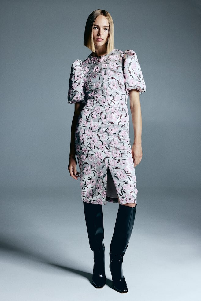ПОВОРАЧИВАЙТЕ H&M ВРАЩАЙТЕ H&M. Приталенное платье длиной до икры из прочной парчи со сложным цветочным мотивом и блестящей металлизированной спинкой. Круглый вырез горловины, короткие объемные рукава-фонарики с узкой резинкой по низу, выраженная талия и накладные передние карманы. Сзади застегивается молния с бегунком оригинальной формы с логотипом бренда и потайной застежкой на крючок. Прямой низ с высоким разрезом по ноге. На подкладке. Рост модели: рост модели 176 см/5 футов 9 дюймов, размер модели 36. Длина: миди Длина рукава: короткий рукав Посадка: приталенная Стиль : Капюшон, Платье-карандаш, разрез Вырез: Круглый вырез Фон рукава: Рукава-фонарики Коллекция: ROTATE H&M Что нужно знать: С карманом