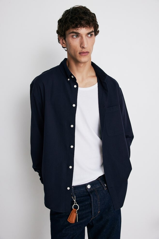 Рубашка из структурированной ткани с воротником на пуговицах, классической планкой на пуговицах, кокеткой сзади и открытым нагрудным карманом. Длинные рукава с регулируемыми манжетами и пуговицей в разрезе рукава. Слегка закругленный низ. Стандартная посадка для комфортного ношения и классический силуэт. Размер: Плечо: Ширина: 54,5 см (размер L), Рукав: Длина: 64,5 см (размер L), Спина: Длина: 78,0 см (размер L) Длина: Стандартная длина Длина рукава: Длинный рукав Посадка: Классический крой Воротник: На пуговицах