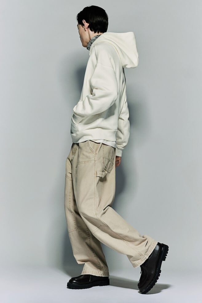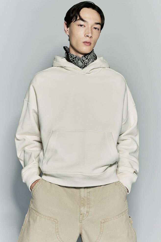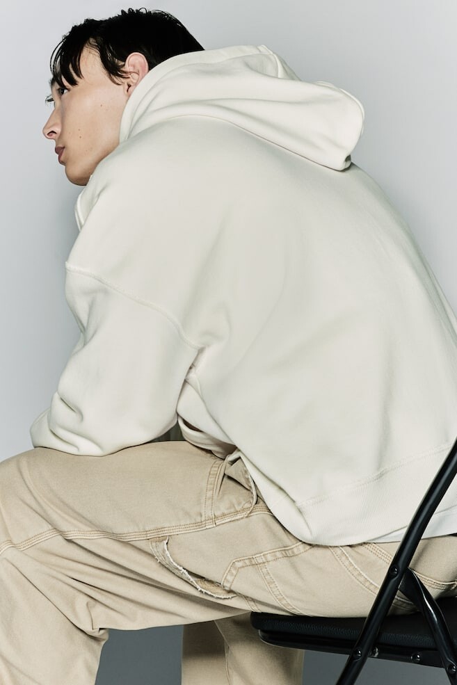 Худи из плотного хлопкового свитшота с мягким начесом внутри. Модель с двухслойным капюшоном внахлест, сильно заниженной линией плеч, карманом-кенгуру, ребристыми манжетами и нижним краем. Модель оверсайз для создания особенно повседневного мешковатого стиля. Размер модели: рост модели 188 см/6 футов 2 дюйма, размер M. Длина: стандартная длина Длина рукава: длинный рукав Подгонка : Oversize Стиль: Свободная рубашка с капюшоном.