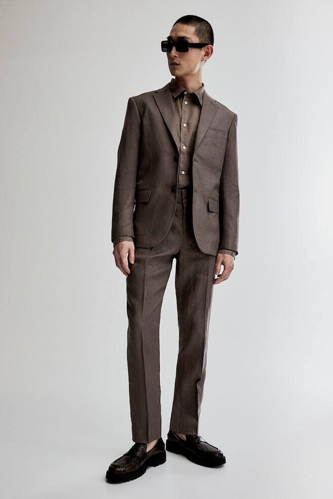 H&M Premium Selection Однобортный льняной пиджак с зазубренными лацканами, декоративной петлей, нагрудным карманом, передними карманами с клапаном и двумя внутренними карманами. Тонкая посадка. С двумя пуговицами спереди, декоративными пуговицами на манжетах и разрезом сзади. Фед. Лен — это дышащий материал, который прекрасно выглядит как в глаженном, так и в мятом виде и со временем становится мягче. Рост модели: Рост модели 183 см/6 футов 0 дюймов, на ней размер 48. Размер: Сзади: Длина: 73,5 см (размер 52), длина рукава: 66,75 см (размер 52) Длина: Нормальная длина Длина рукава: Длинный рукав Посадка: Slim Fit Воротник: с лацканами Стиль: Однобортный Концепция: H&M MAN Что нужно знать: H&M Premium Selection