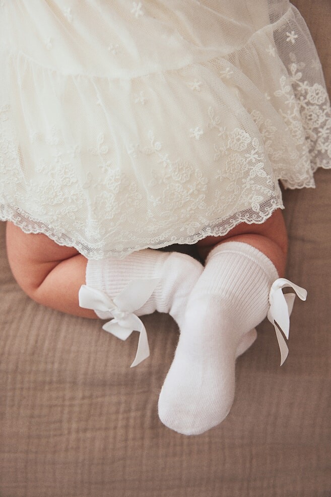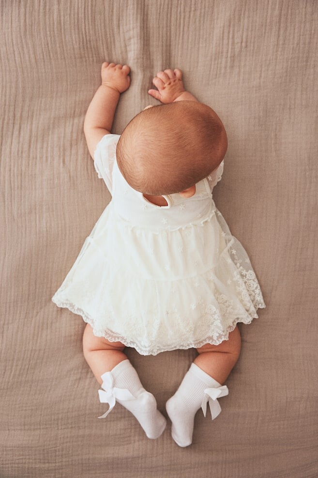 Платье из мягкой расшитой сетки с вшитым телом. Круглый вырез горловины с отделкой из трикотажа и короткие рукава с эластичными манжетами и отделкой воланом. Слегка расклешенная ярусная юбка и присборенный оборчатый шов посередине. Шлица на пуговицах и кнопки внизу для легкой смены подгузников. Юбка на подкладке. Длина: Миди Длина рукава: Короткий рукав Посадка: Классический крой Фильм: Расклешенный, Капелька Вырез: Круглый вырез Фон рукава: Рукава-фонарики