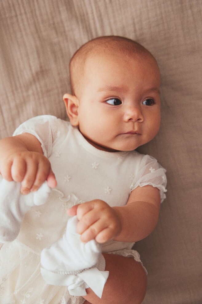 Бренд: H&M Цвет: белый Состав: Внешний слой: Полиамид 100% Подкладка: Хлопок 96%, Эластан 4% В общий вес изделия входит: 76% органический хлопок Вес мелкие детали, такие как нитки, пуговицы, молнии, украшения и принты, не учитываются. Материал: Трикотаж, Сетка.