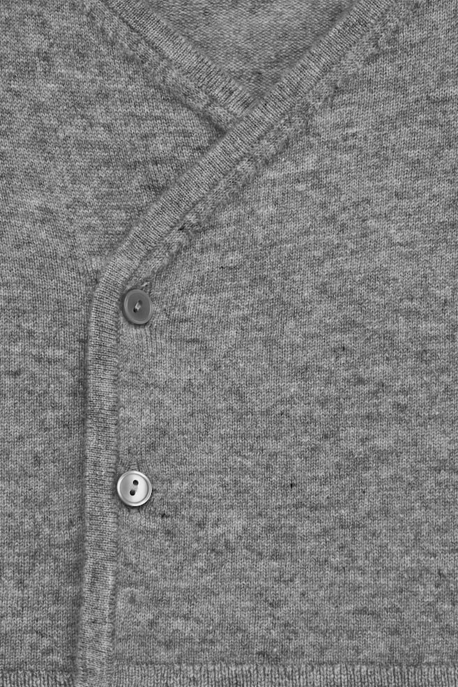 Жакет с запахом связан чулочной вязкой из особо мягкого кашемира. Модель с V-образным вырезом, двумя пуговицами спереди и ребристой отделкой. Стандартный крой.