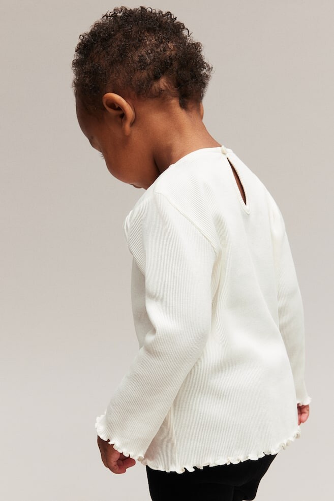 Рубашка с длинными рукавами из хлопкового трикотажа в рубчик с короткой плетеной кокеткой в форме банта. Круглый вырез с каплевидным вырезом и пуговицей на шее, а также оверлочные швы на рукавах и подоле.